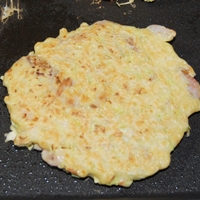 鉄板は200度に温まったところにしっかりと油を引き先ほどの生地を乗せて焼いていきます。(お好みで薄切りの豚肉を鉄板にしいてから、その上に生地を乗せるのもOKです)